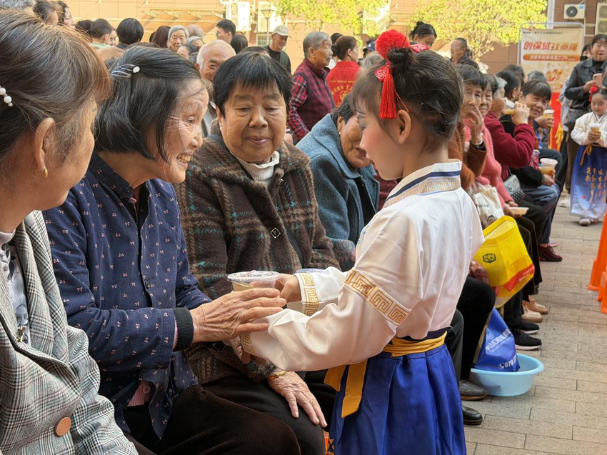 在欢快的音乐声中,活动正式拉开帷幕。东风路街道党工委书记曹文蒂登台致辞,以亲切的话语为老人们送上节日祝福。随后,精彩节目轮番上演:儿童舞蹈《中华孝道》以童真诠释传统美德,黄梅戏选段韵味悠长,汉服秀《华夏霓裳》绽放传统文化魅力,萨克斯红歌串烧唤起时代记忆,气舞、帽子秀增添趣味,小品《五个媳妇一个婆》以接地气的剧情传递家庭温情,引得掌声、笑声不断……其间穿插的有奖问答环节,围绕重阳习俗与养老政策展开,老人们踊跃应答,在互动中收获知识与小礼品,现场氛围持续升温。