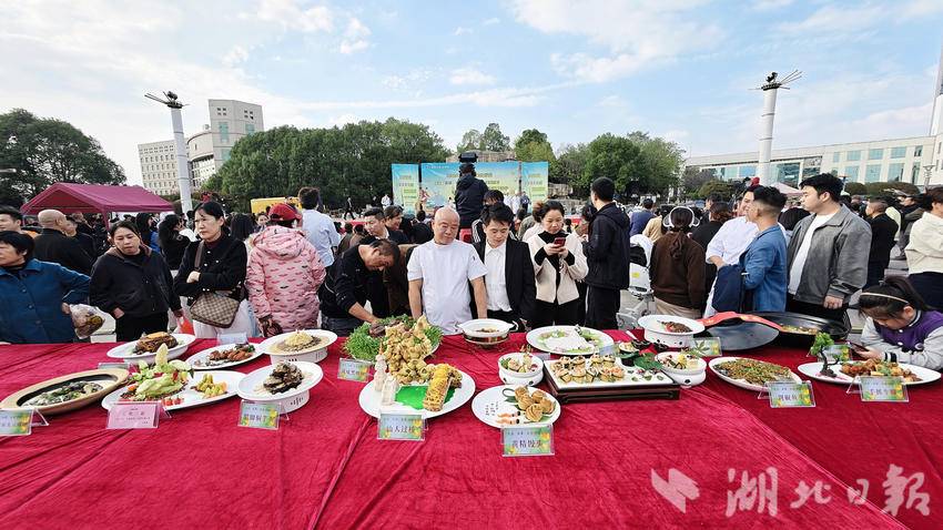 特色宴席区里,二十道崇阳特色菜整齐陈列、造型各异,从传统的崇阳腊味、糯米粑粑等,到创新的雷竹笋系列菜品,全方位展现了当地饮食文化的深厚底蕴。不少观众拿出手机拍照打卡,沉浸式感受“舌尖上的崇阳”,让美食成为传递崇阳文化的生动载体。