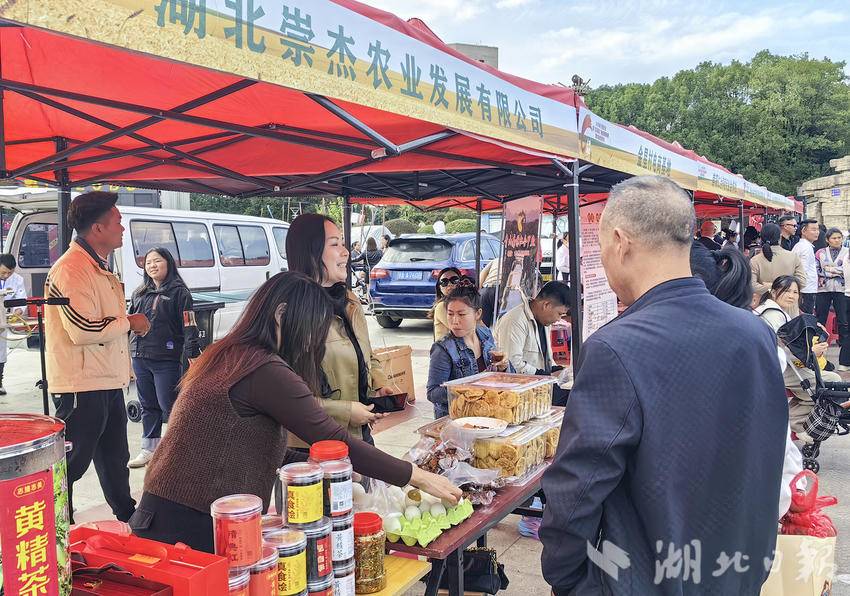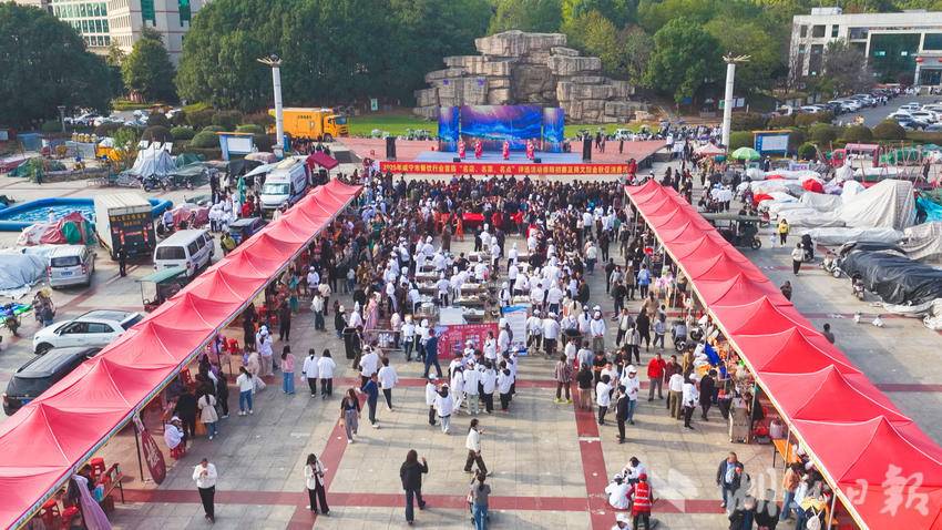 除了紧张的评选环节,现场还设置了崇阳特色农副产品展览区,40余家本土企业带来特色农产品、手工艺品等,借着活动的热度开展金秋促消费活动,推动美食与本地农副产品深度联动,延伸“餐桌”到“田间”消费链条,引得观众纷纷驻足、品尝、购买。同时,活动穿插精彩的歌舞表演,欢快的旋律与浓郁的美食香气相互交融,让现场氛围愈发热烈。