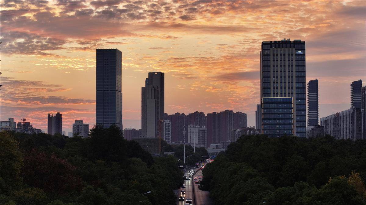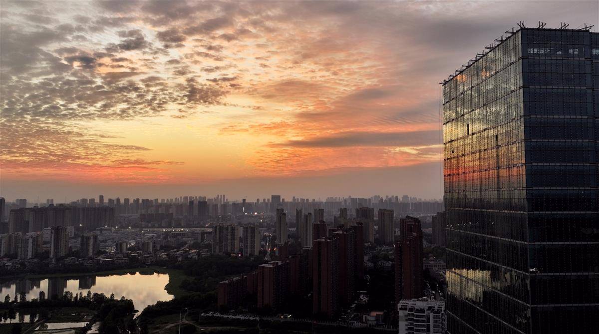 10月24日傍晚,武汉天空上演橘色晚霞盛宴。云层透光如流金般晕染,秋日浪漫刷屏城市朋友圈。(湖北日报全媒记者 陈少哲 摄)
