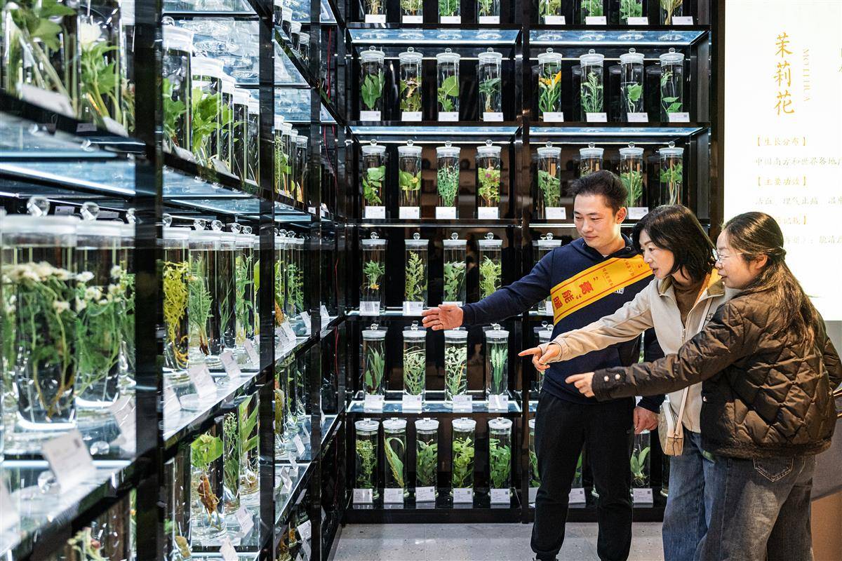 叶开泰中医药博物馆一楼为养生超市和药膳茶咖区,草本咖啡、食养药膳等产品备受市民好评。二楼展区则通过“科技+文化”的理念,构建了沉浸式观展体验。其中,标本区以创新设计理念,打造出水晶宫式中草药标本墙,分类展示数百种道地药材,视觉化呈现本草之美。