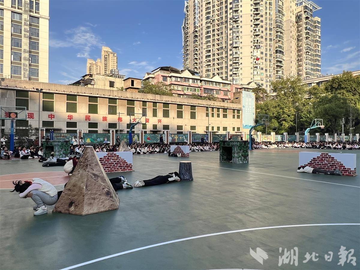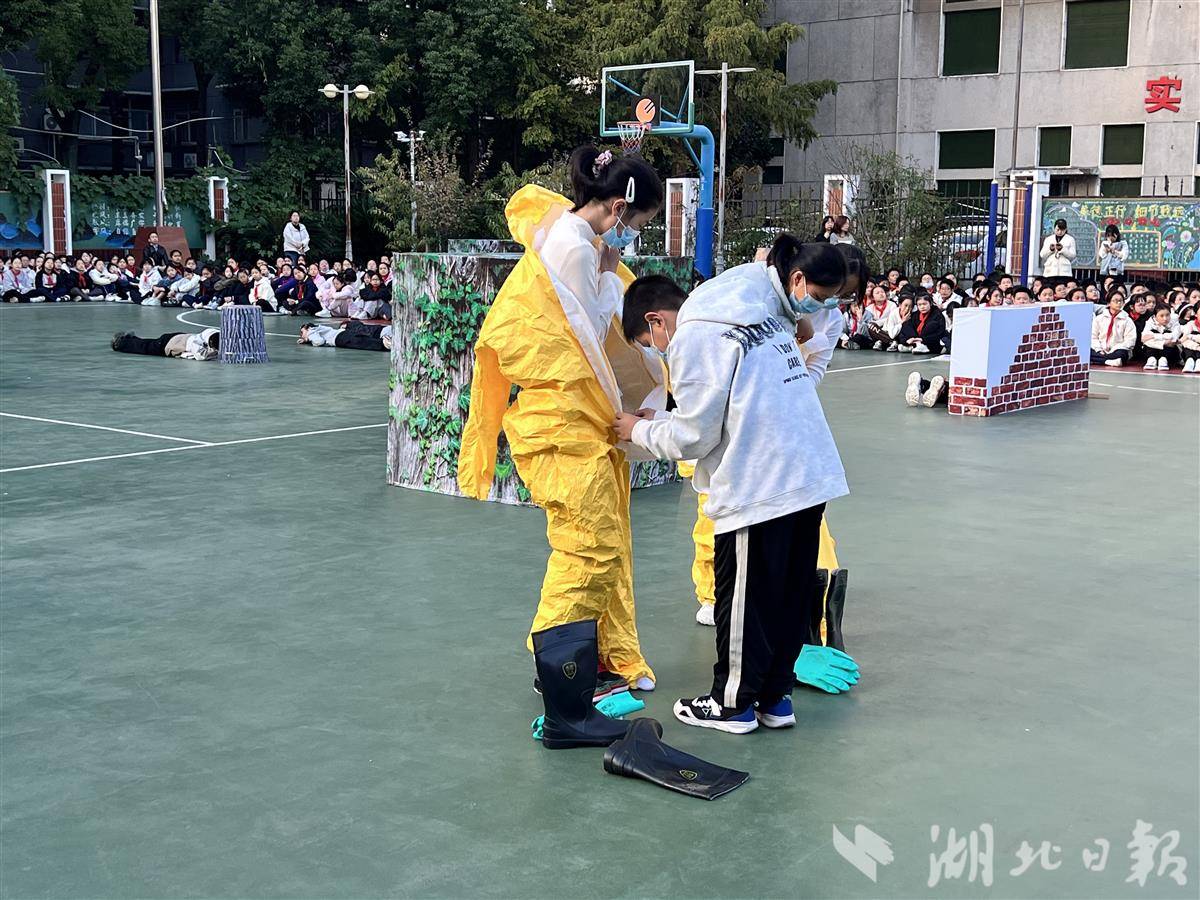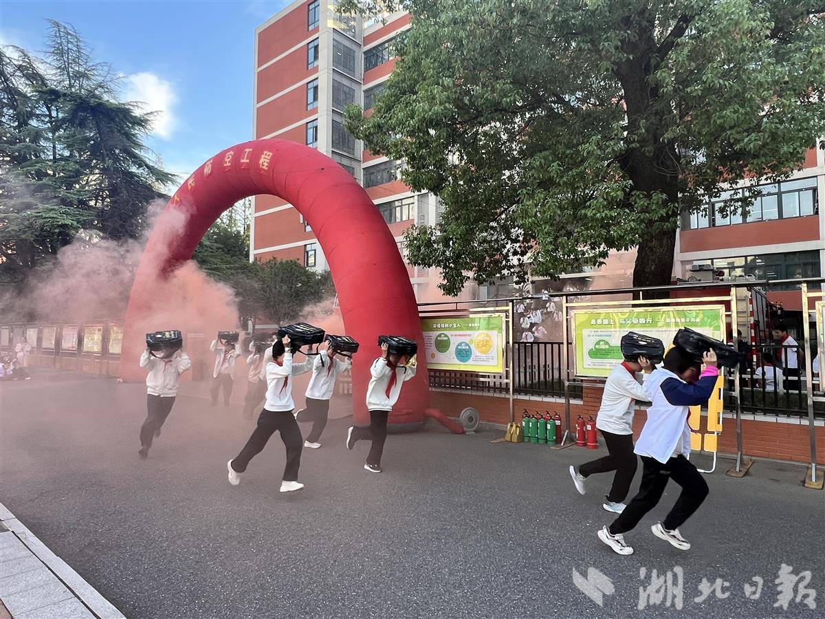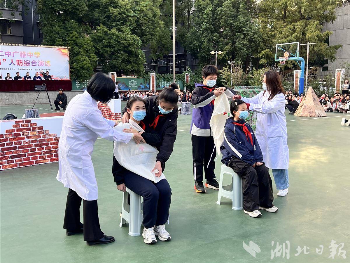 湖北日报讯 (记者黄磊、通讯员胡雪琴)10月24日下午四点整,武汉市二中广雅中学校园内浓烟滚滚。上百名七年级学生头顶人防应急包,在老师们的引导下,迅速撤离教学楼,进入人防工程躲避。