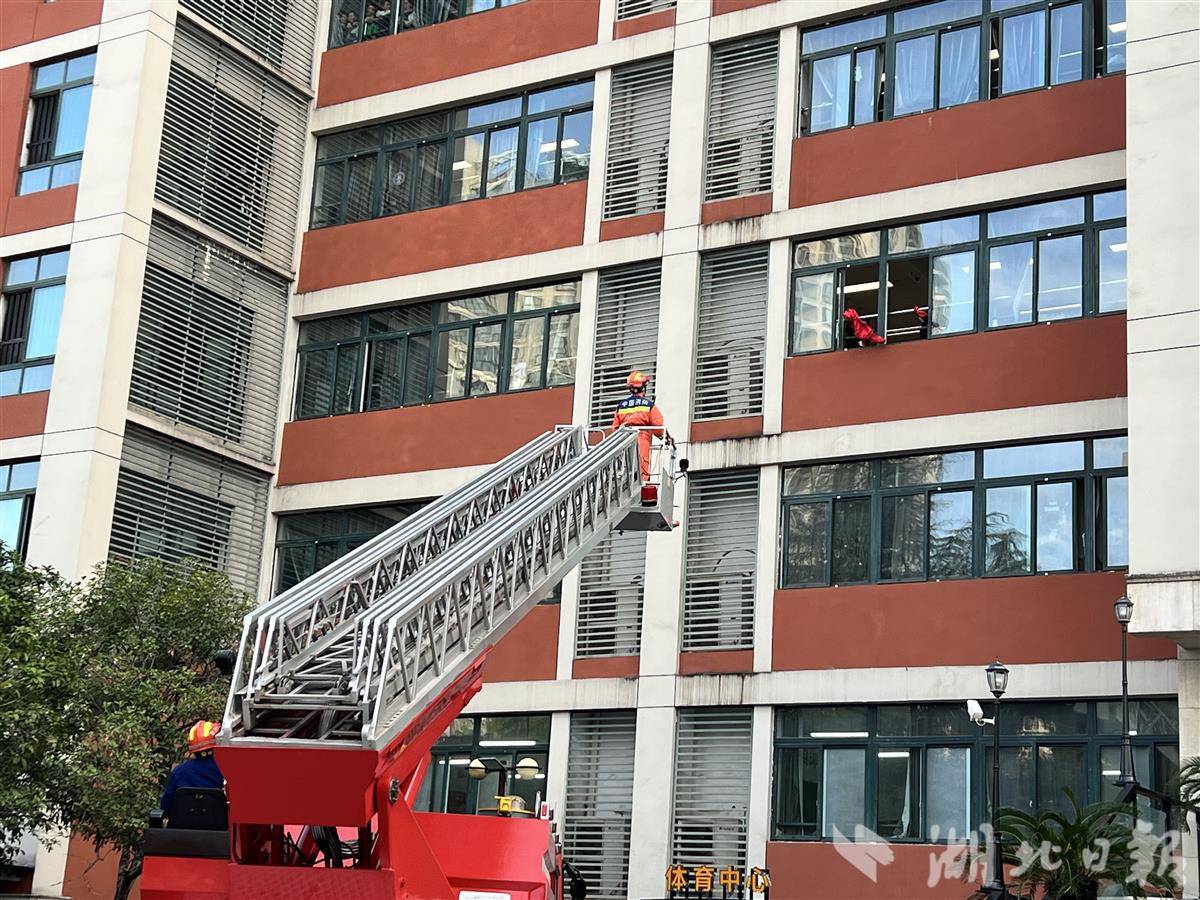 此时,只见两名同学正“被困”教学楼内,他们将校服作为示意物,正在窗口处挥舞,亟待救援。看见此景,消防中队立即调动云梯车对被困学生进行高空营救。两名学生在消防员的帮助下安全登上云梯,成功获救。