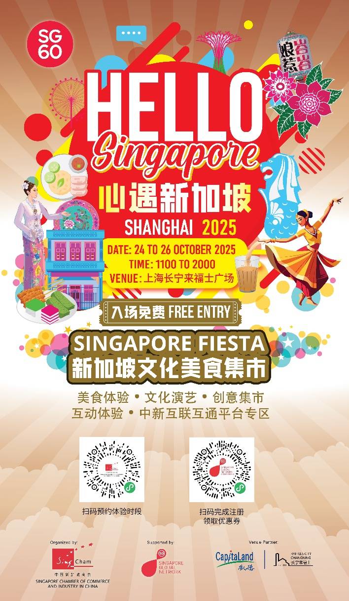 10月24日至26日,长宁来福士广场户外草坪将通过五大主题街区、涵盖约15家新加坡美食品牌的精巧布局,化身微缩版新加坡。以“视觉、听觉、味觉、触觉”四觉体验为主线,覆盖人文、历史、民族和风景四大元素,现场不仅复刻了甘榜格南的马来风情、实龙岗路的小印度色彩、如切路的娘惹韵味,更打造了滨海湾花园的未来可持续展区与纬壹科技金融互动空间。五大新加坡最具特色的经典文化街区集中呈现,通过展览、美食、互动、表演等活动为大众带来丰富多元的文化体验。