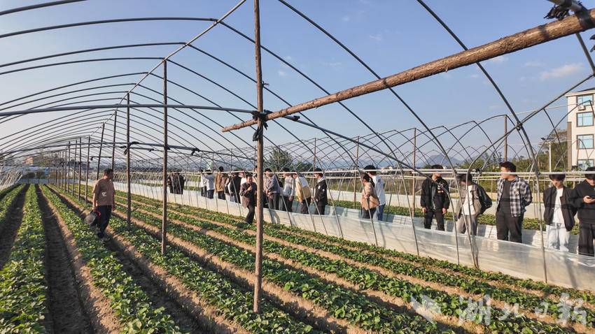 理论课结束后,在老师们的带领下,学子们带着满满的求知欲和好奇心走向田间地头,开启实操学习环节。田间专家一边耐心讲解,一边手把手进行指导。学子们蹲在田埂边,仔细观察草莓的生长态势,认真观摩工作人员给草莓覆膜的操作手法,将课堂理论知识转化为解决实际问题的能力。