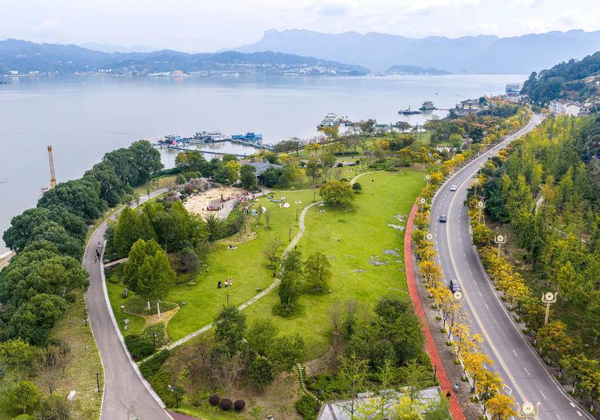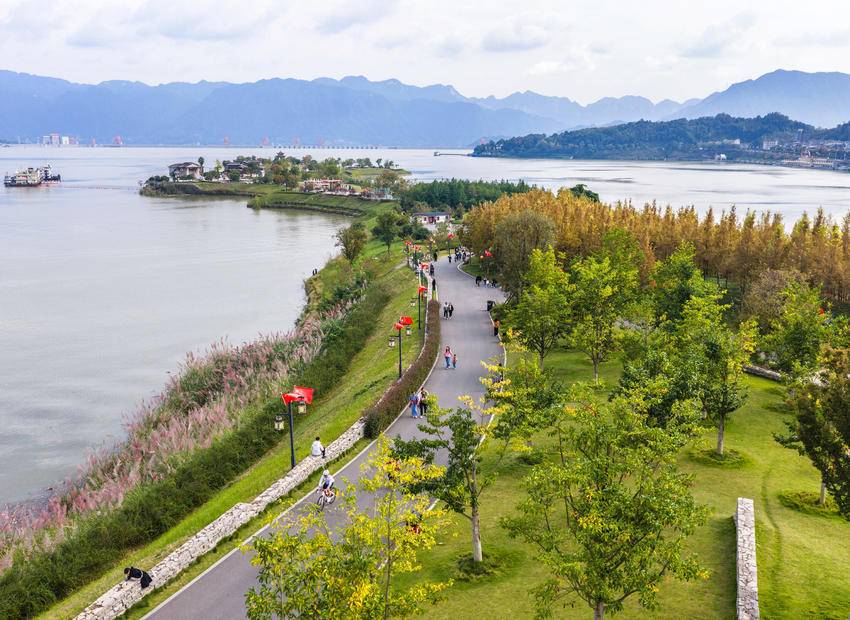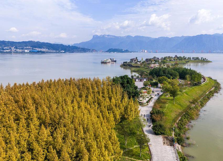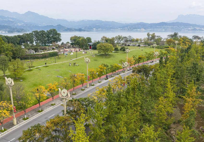 10月26日,人们在湖北省秭归县茅坪镇望江公园赏秋游玩(无人机照片)。