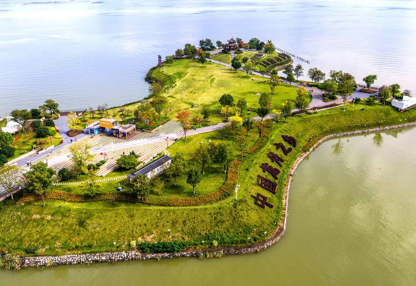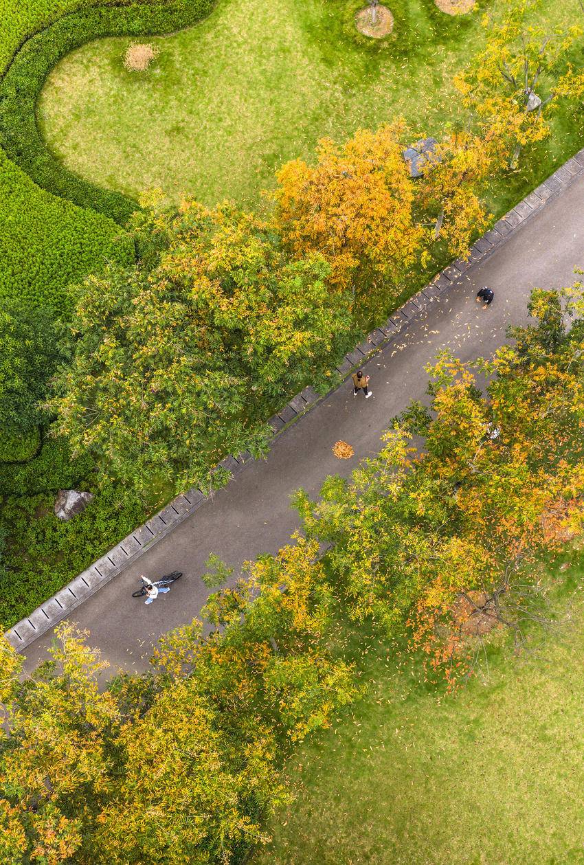 10月26日,人们在湖北省秭归县茅坪镇木鱼岛天问公园赏秋游玩(无人机照片)。