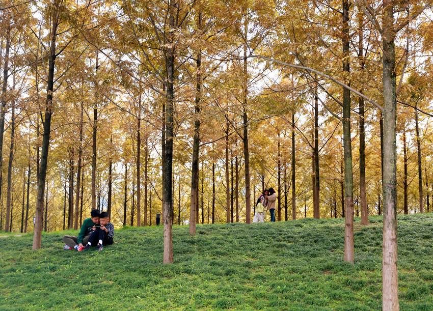 10月26日,人们在湖北省秭归县茅坪镇木鱼岛天问公园赏秋游玩。