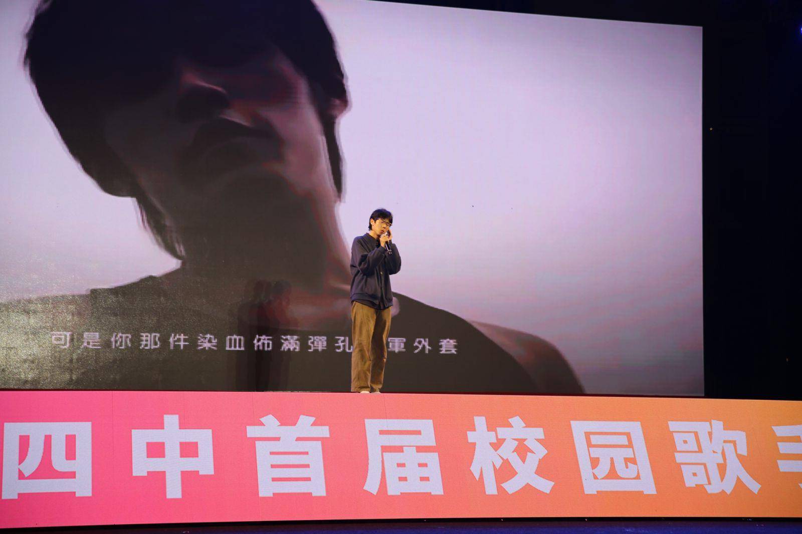 当晚7:00,东操场灯光绚丽,人头攒动。大屏幕播放当日运动会的开幕式混剪视频,瞬间点燃现场气氛。主持人开场后,大赛启幕。方笑宇老师以一曲《倔强》引爆全场。