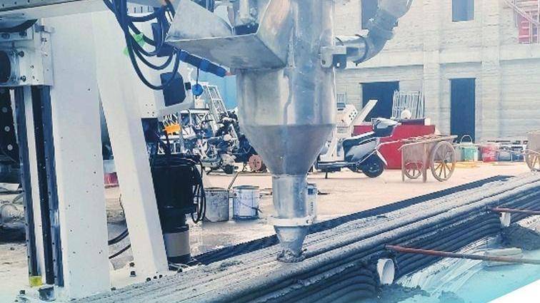 当日,随着工作人员输入工艺参数指令,8米×8米级的3D打印机启动。随后,混凝土浆体经泵送系统注入打印机送料管,由“自动化”手臂——打印喷嘴精准挤出,按照预设的路径逐层打印堆积成型,全程实现“无模化”施工。不到半天时间,只见一面长5米、高2米、重达8吨,印有江豚浮雕的墙体便呈现在眼前。