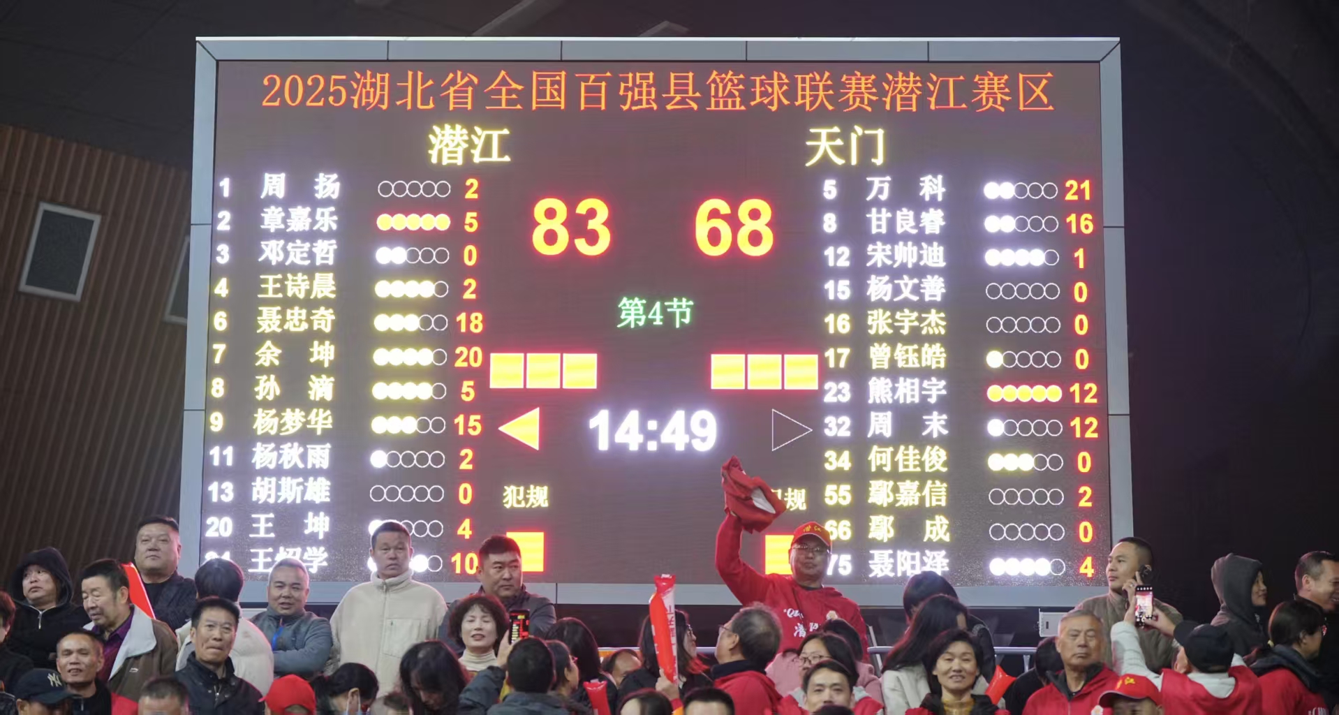 湖北日报客户端讯(通讯员 罗珊珊)10月25日晚,2025湖北省全国百强县篮球联赛焦点战在潜江市体育活动中心开赛,“中国小龙虾之乡”潜江队主场迎战“中国蒸菜之乡”天门队,最终潜江队以83:68获胜。