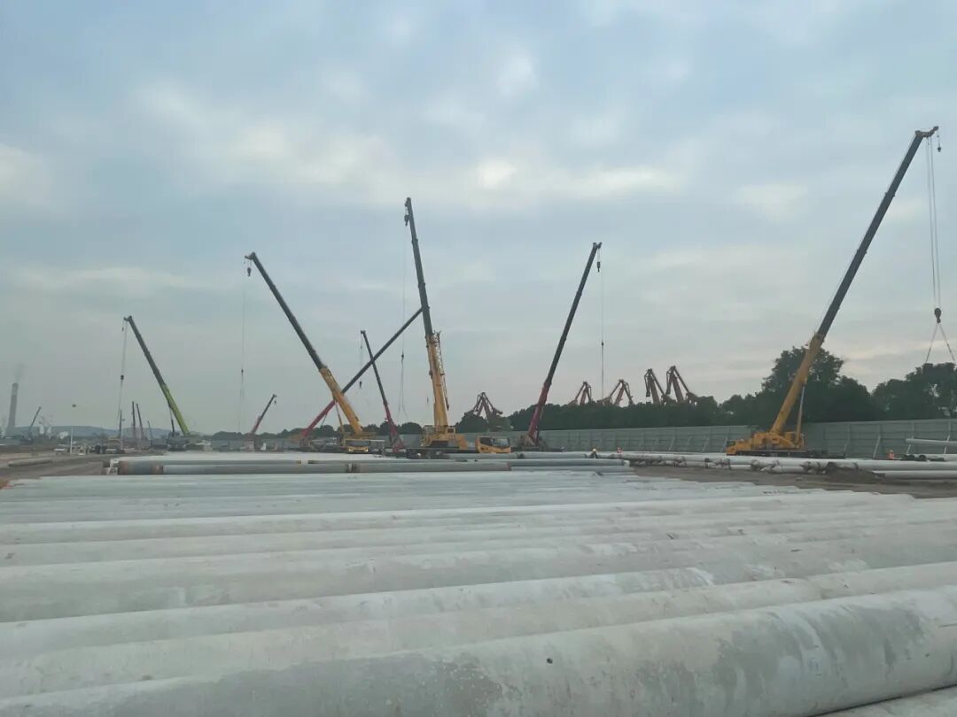 9月3日,开工准备工作进入实战。以厂房基础施工为例,根据设计,504亩的用地上要打下5000余根桩基。10月24日,施工现场数十台吊车挥舞着钢铁长臂,运送着一头平一头尖的钢筋混凝土桩基,静压桩机则抱起桩基,将其蹬入地下。10月3日以来,2700多根桩基已经入地。