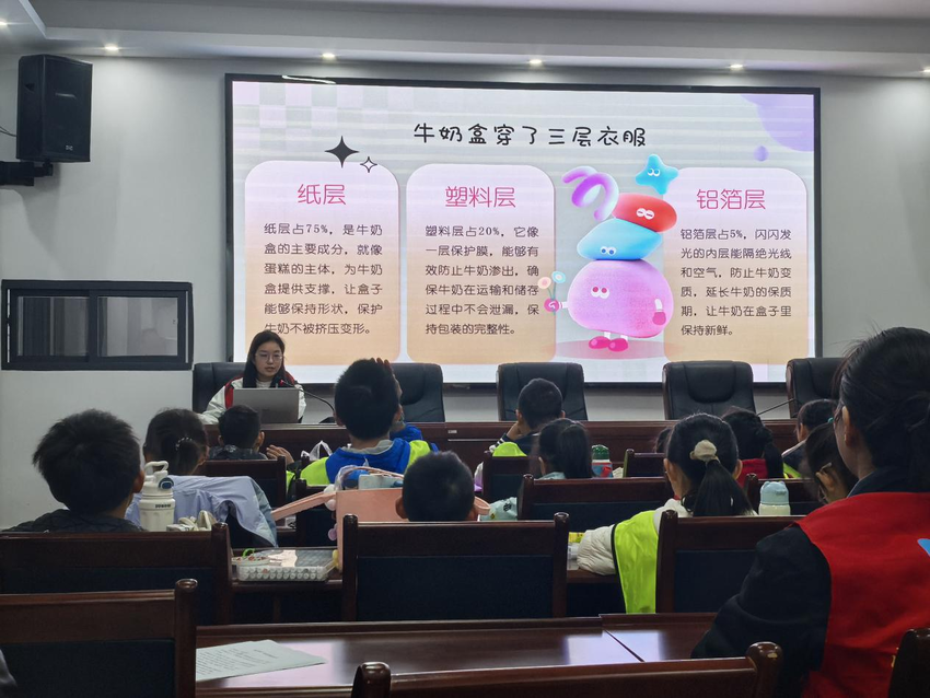 在互动实践环节,志愿者通过“遇到乱扔牛奶盒该如何劝说”的情景模拟,引导小朋友们思考环保责任,鼓励小朋友上台分享想法,邀请他们担任“牛奶盒循环小讲师”,回家后向家人、邻里传递回收知识。