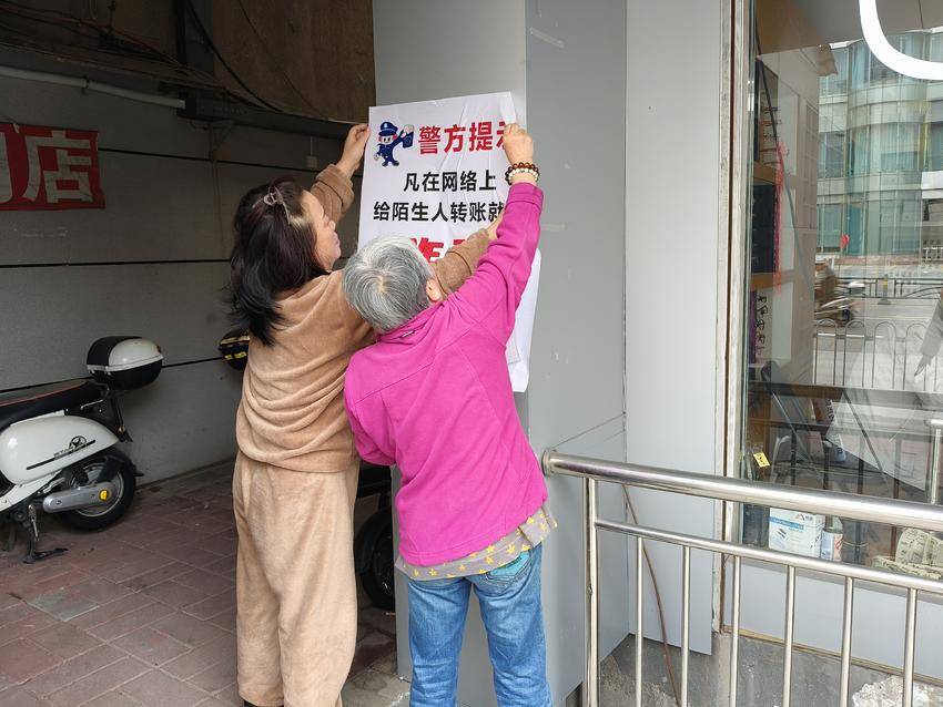 在活动现场,居民们分工明确、配合默契。有的负责搬运海报,有的负责选择合适的张贴位置,有的则负责向过往居民介绍反诈知识。大家热情高涨,干劲十足,充分展现了社区居民团结一心、共同守护家园安全的责任感和使命感。