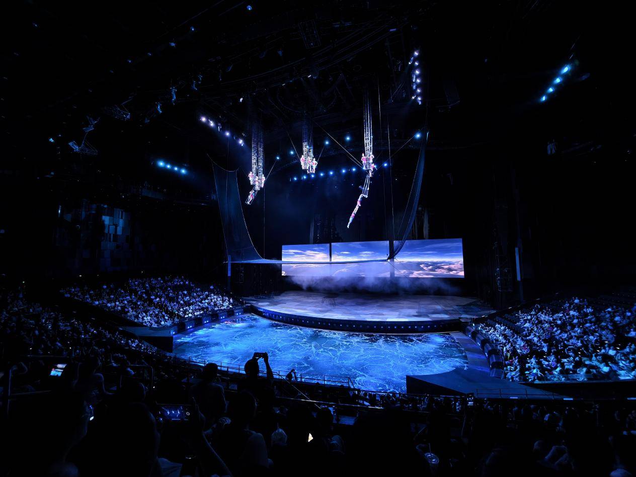 随着灯光渐暗,汉秀剧场标志性的巨型水幕缓缓展开,以震撼的视听效果拉开帷幕。汉秀剧场版《水秀》以水元素为核心,将舞蹈、高空跳水、环球摩托、空中飞人、吊环等多元艺术表演形式完美融合。作为现代科技与跨界艺术融合的大型水秀表演,充分利用汉秀剧场世界级的舞台设备,通过4D沉浸技术为观众营造出身临其境的沉浸式体验,让观众仿佛置身于奇幻的水世界中,全方位感受演出的魅力,每一个段落都引得现场代表与观众频频鼓掌。