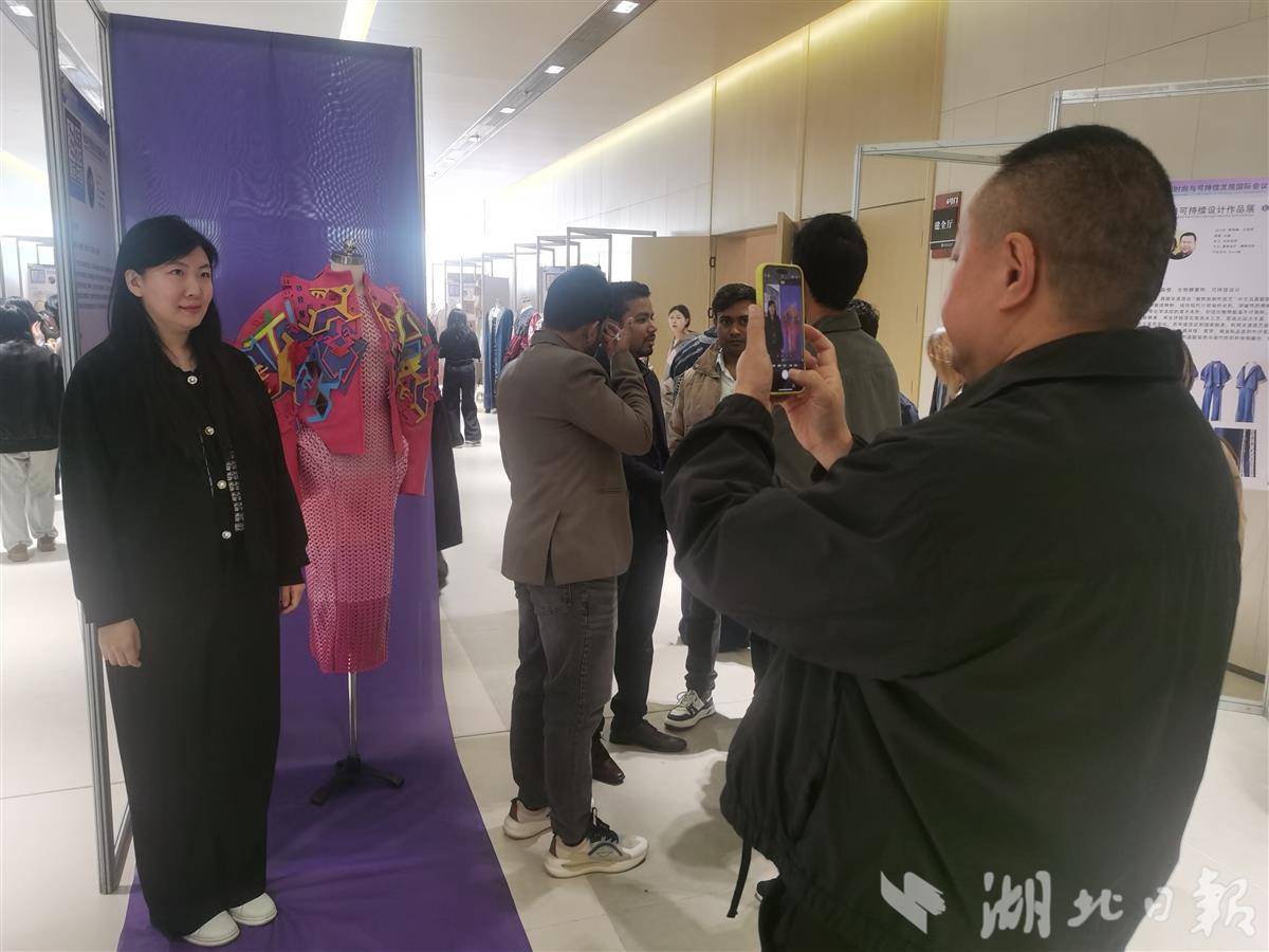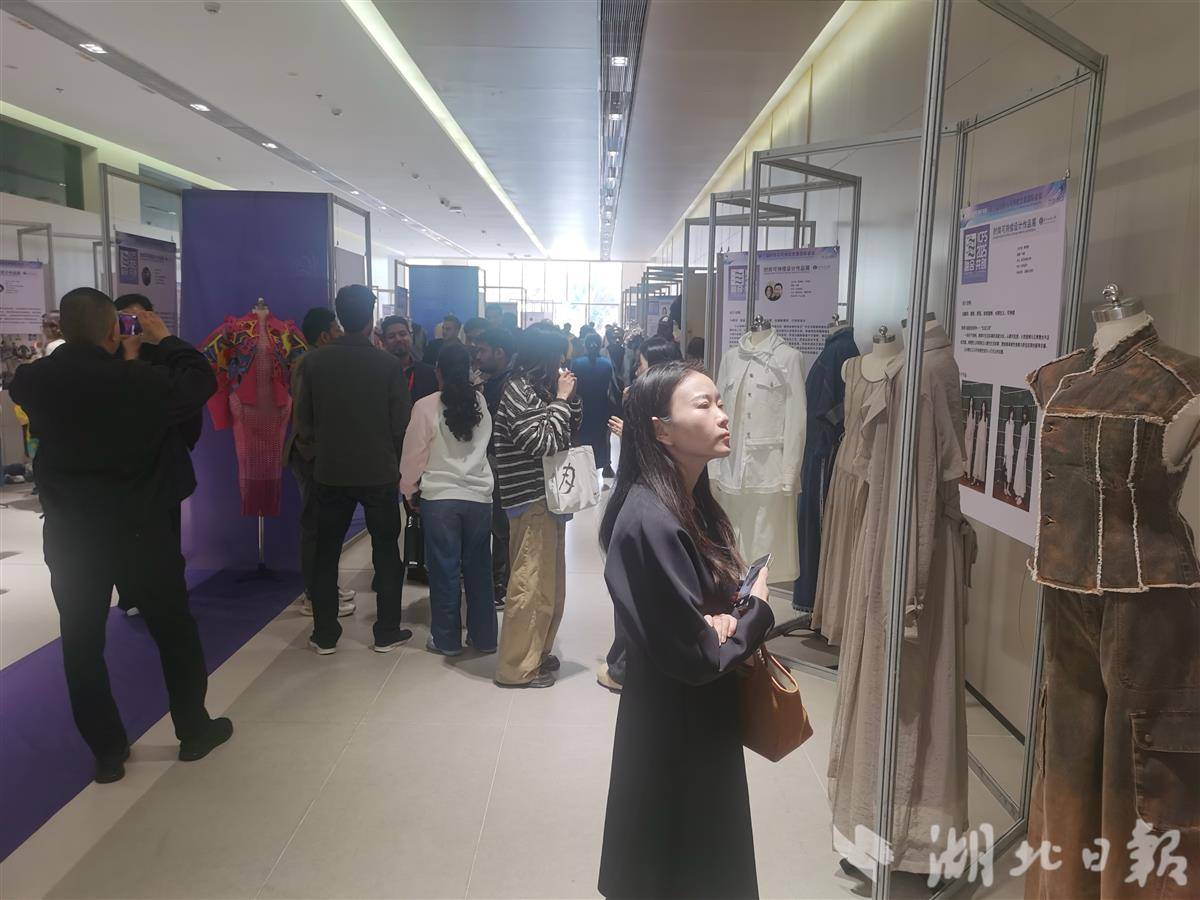 10月27日,与会嘉宾兴致勃勃地参观时尚可持续设计作品展。(湖北日报全媒记者包东喜摄)
