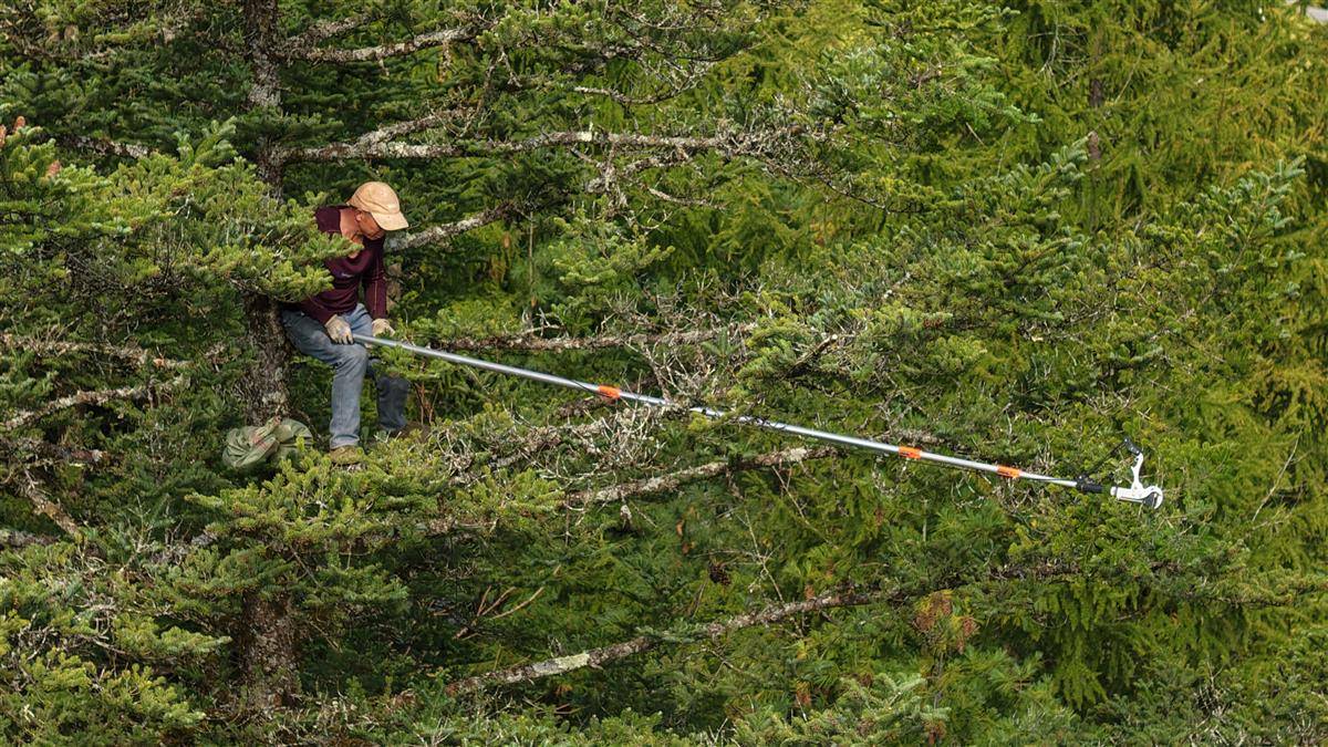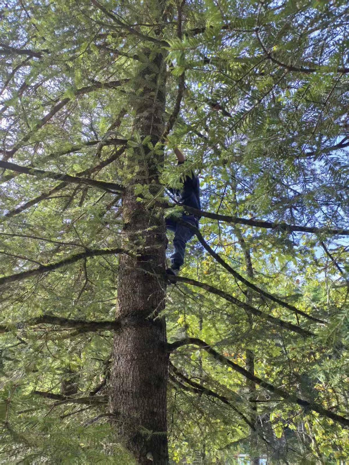 采种人爬上20多米高秦岭冷杉树梢采集种子
