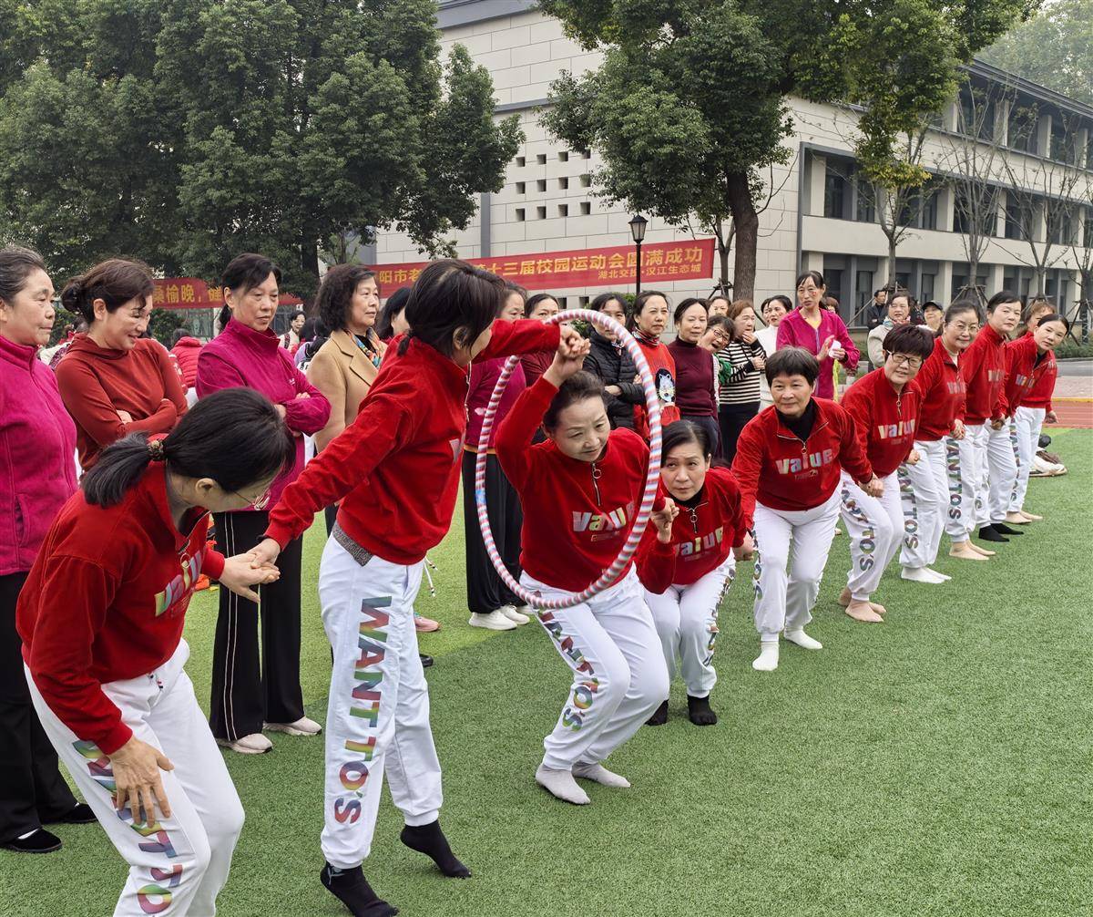 趣味项目的赛场热闹非凡。呼啦圈传递项目中,队员们默契配合,小心翼翼地用身体传递呼啦圈,展现出不亚于年轻人的敏捷。接力赛的跑道上,选手们用乒乓球拍托着乒乓球,全神贯注地前行,耳边是同伴们响亮的“加油”声。观众席上,“加油”声、掌声此起彼伏,整个校园都沉浸在欢乐的海洋中。