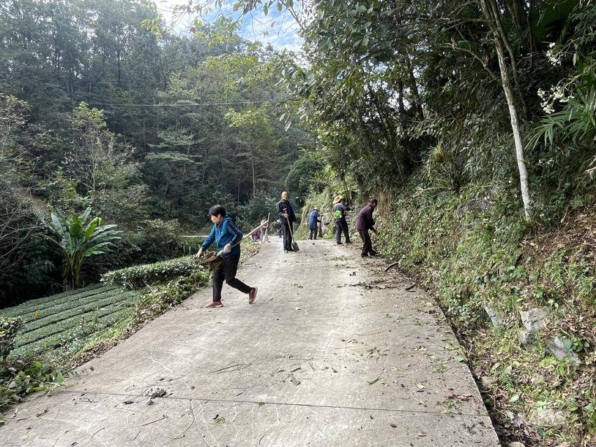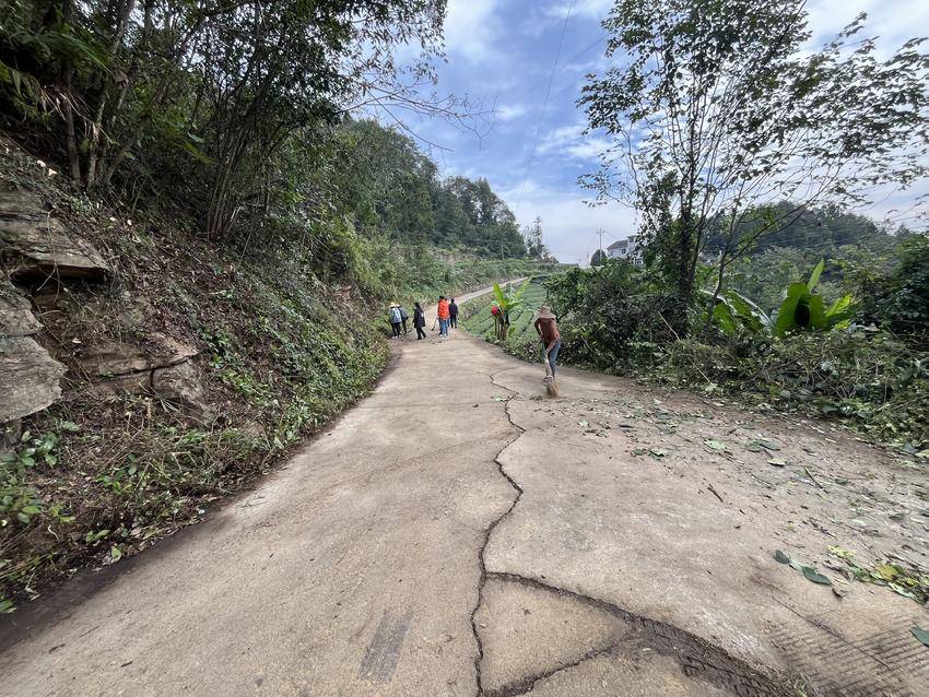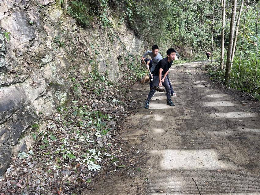 活动现场,志愿者们自带扫帚、铁锹、锄头、垃圾袋等工具,在村干部的统筹安排下分工协作、干劲十足。两名初中学生手持铁锹,认真清扫路面散落的落叶和下雨冲到路面的泥土,动作麻利且专注,成为劳动队伍中一道充满朝气的风景线。其他志愿者沿着公路分段推进,有的清理路肩杂草和边沟淤泥,有的合力搬运废弃杂物并集中清运。尽管汗水浸湿衣衫,但大家热情不减,不同年龄的身影相互配合,勾勒出一幅生动的“共建共治”画面。