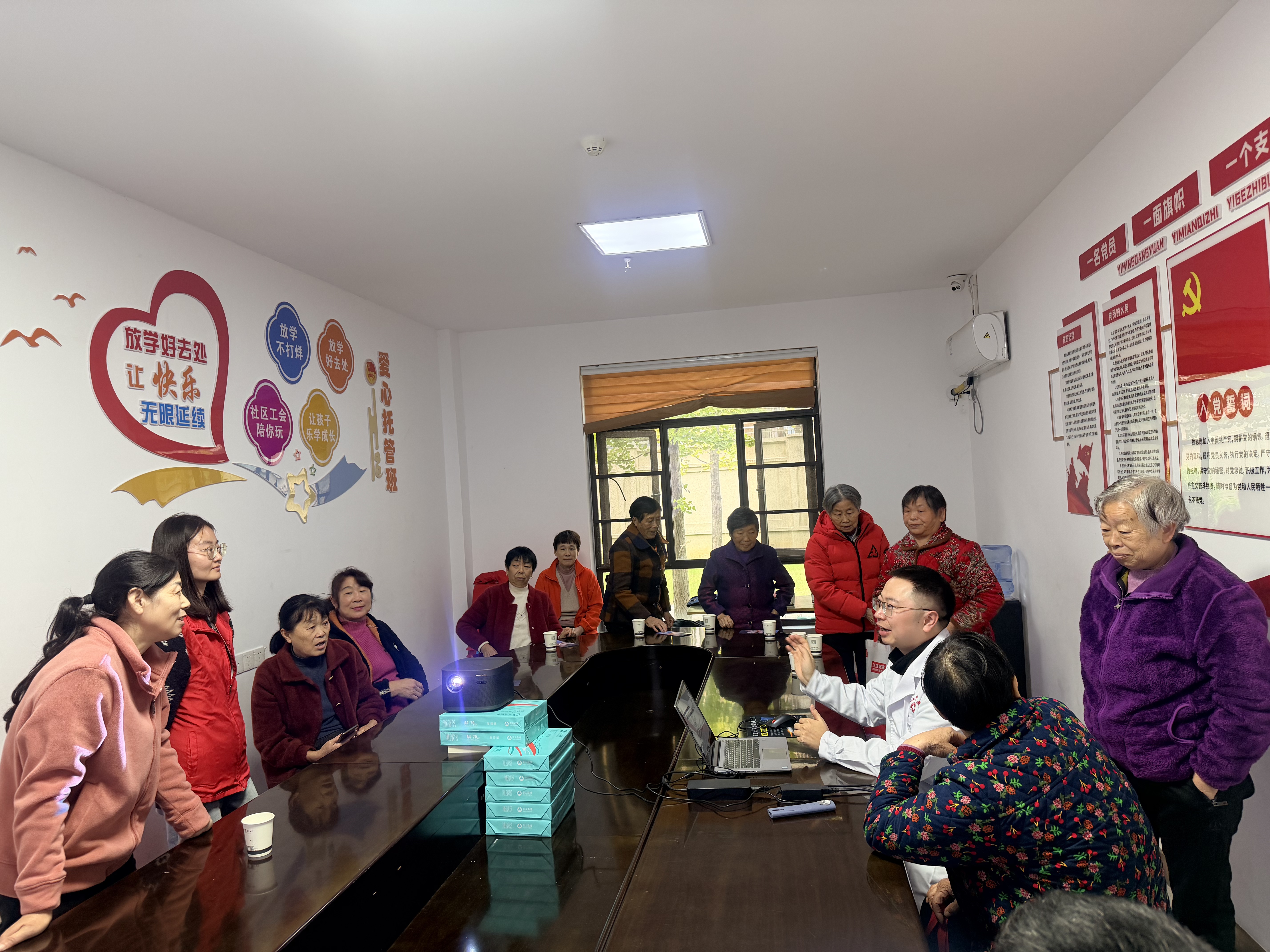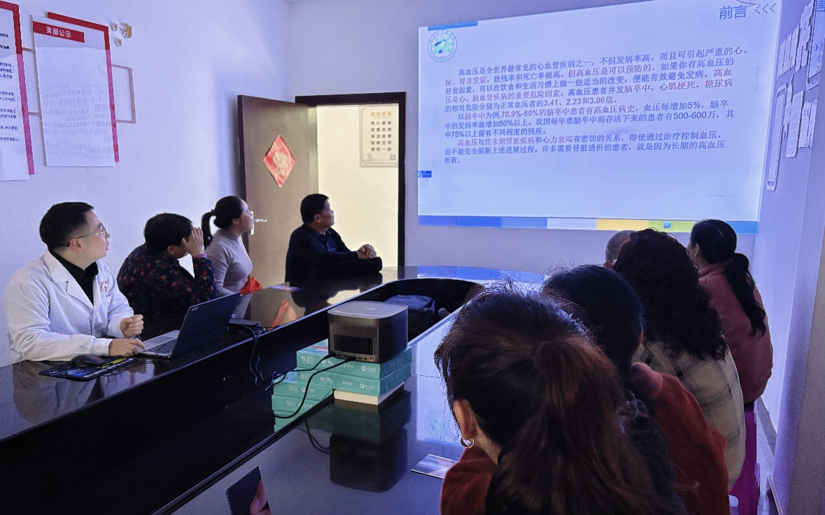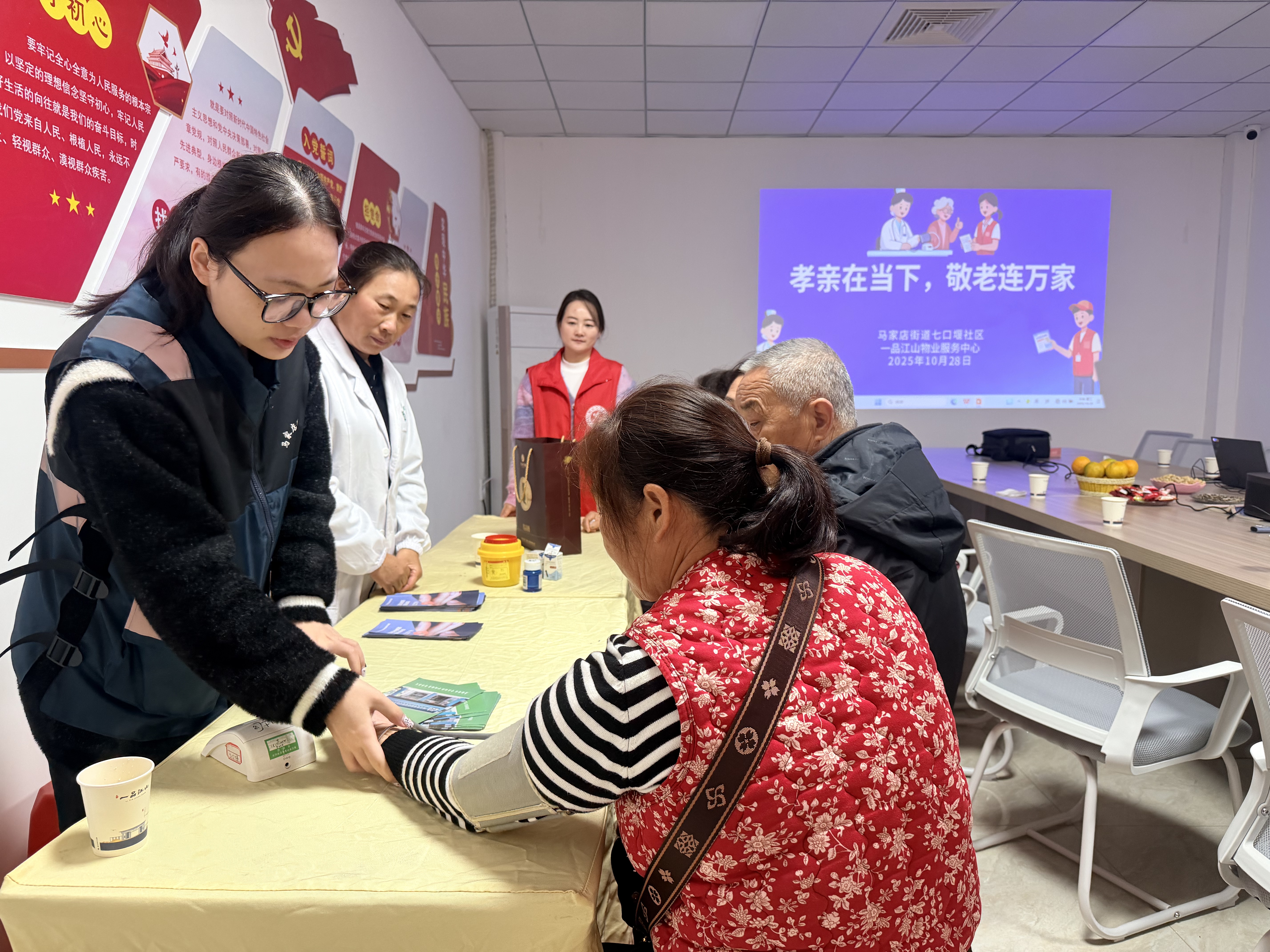 10月28日上午,市中医医院医生龙华在一品江山小区物业服务中心围绕高血压防治开讲,特别补充“晨起血压监测技巧”“居家养生小妙招”等实用内容;志愿者有序帮老人记录检测数据,并搀扶行动不便的居民入座,三方配合让服务高效又暖心。“不用跑医院,在家门口就能听课、检查,社区考虑得太周到了!”居民张阿姨的称赞道出大家心声。