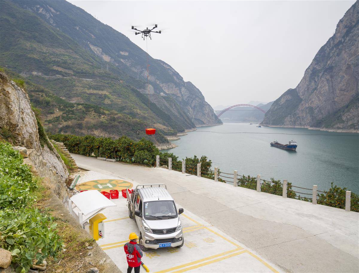 鄂西秭归县“四季有橙”。峡江两岸的果园,无人机将一筐筐脐橙吊运出山。