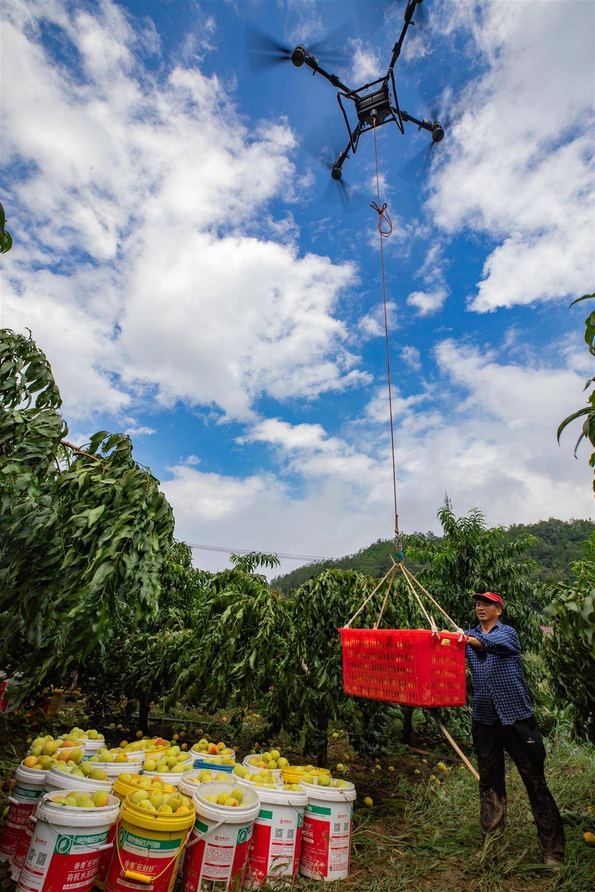 2025年8月15日,在秭归县郭家坝镇西坡村,果农们正在操作无人机吊运锦绣黄桃。(湖北日报通讯员 彭强 摄)
