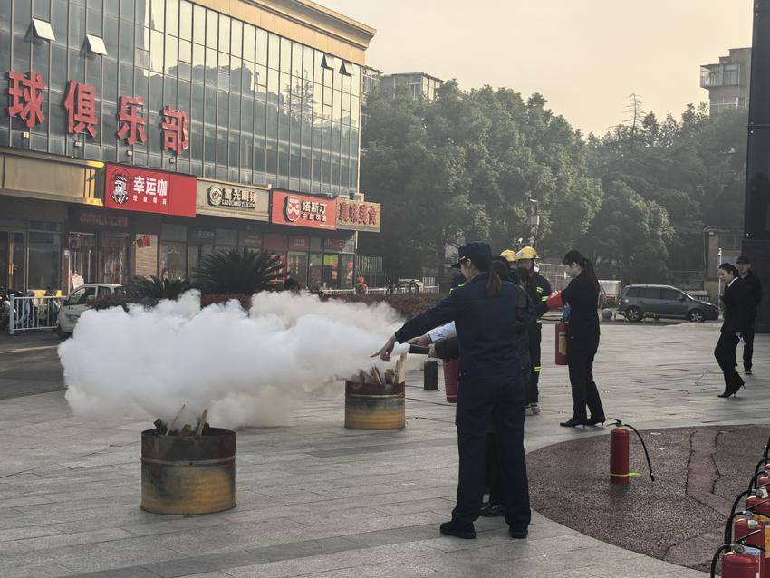 室外实操环节中,消防员现场示范灭火器“提、拔、握、压”四字口诀,强调需在2-3米距离对准火焰根部扫射。在灭火毯演示中,消防员讲解其耐高温特性及窒息灭火原理,演示“握带展开、上风接近、全面覆盖”的操作步骤,提醒需持续覆盖防止复燃。参与者轮流实操,消防员逐一纠正动作偏差,确保人人掌握核心技能。