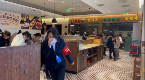 室内紧急疏散演练随即启动。模拟商场因电路短路引发火灾,烟感报警器触发后,商场中控室立即启动紧急疏散,引导人群沿疏散指示标识向楼梯间撤离,全程禁止使用电梯,仅用几分钟便将所有人员疏散至室外安全集合点。