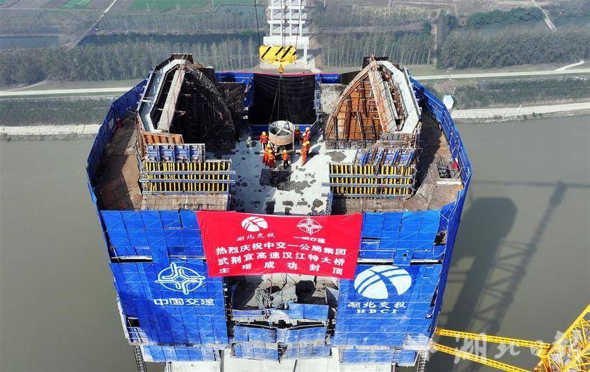 10月28日上午,随着最后一斗混凝土浇筑到位,武荆宜高速控制性工程——汉江特大桥主塔顺利封顶,标志着该桥建设取得重大突破。