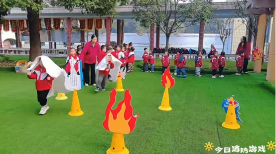 随后,趣味消防游戏环节点燃全场热情。“消防接力灭火”游戏中,幼儿化身“小小消防员”,手持灭火毯在奔跑中体会消防工作的紧张;“模拟烟雾逃生”环节,消防员用安全烟雾弹搭建模拟火场,指导幼儿弯腰、捂鼻,沿着墙壁快速有序撤离至操场安全区域。