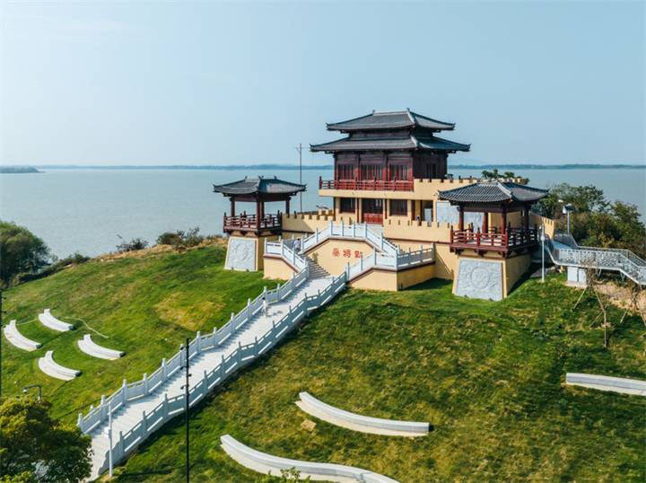 岛上最有名的景点是点将台,这里是看日出的绝佳地点。拍照的最佳位置是点将台下面的湖边栈道,也是看夕阳的最佳机位。这里的点将台相传是中国古代三国时期东吴名将周瑜操练东吴水师之地,整个建筑高耸在湖边叶岩沉积的山上,是岛上的制高点,沿步梯一路登高,可以俯瞰梁子岛四方水面。