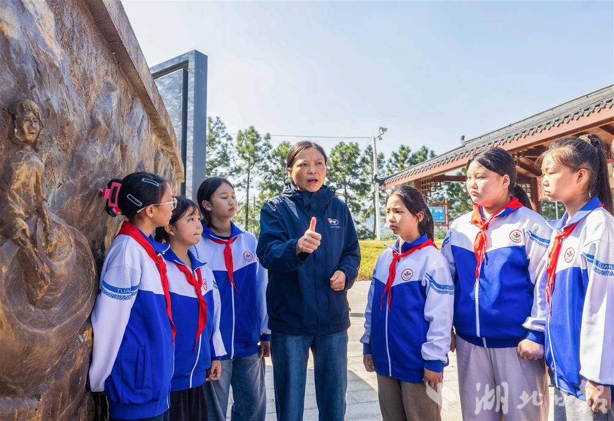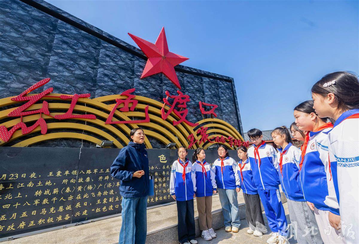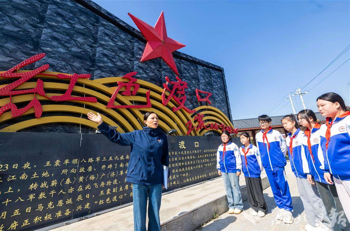 10月23日,武穴田家镇铸钱炉村红色渡口文化广场,“贾明舜志愿讲解队”的讲解员贾秀丽,为武穴市实验小学的学生讲述红色渡口的峥嵘往事。从红色后方医院医生贾盛发救死扶伤,到艄公贾道鸣舍生忘死,贾明舜坚持传承义务宣讲,再到贾秀丽接棒,四代人以初心守护红色渡口,赓续红色精神。孩子们凝神聆听,红色基因深植心田,渡口精神在传承中生生不息。(湖北日报全媒记者 薛婷 通讯员 郭占军 冯洁 摄)