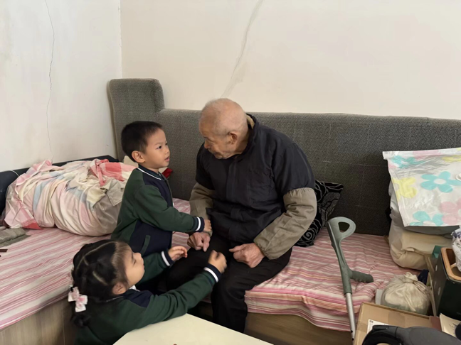 在这些老师家里,孩子们将客厅变成“临时舞台”。随着《青春快出发》的音乐响起,萌娃们蹦跳着完成“摘桃”“送福”等动作。原本坐在沙发上的爷爷忍不住起身,跟着节奏拍手:“跟这帮小娃娃跳得我腰都酸了,但心里甜!”表演结束,孩子们还为老人捶背,让老人笑得合不拢嘴。