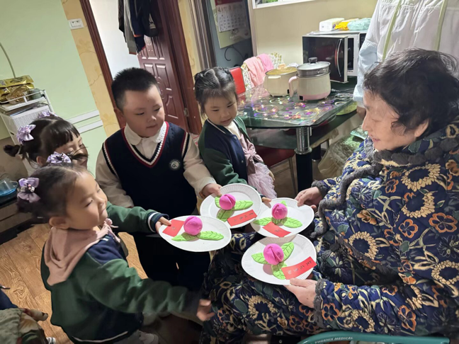 “咚咚咚——”上午9点,5岁的乐乐敲响一位老人的家门。门缓缓打开后,孩子们齐声喊出“奶奶好”,双手捧上用黏土捏制的“寿桃”,桃尖还点缀着绿色黏土“叶子”。“这是我揉了三次才圆的呢!”乐乐仰着脸说。这位奶奶摸着寿桃上的“绿叶”红了眼眶:“这比真桃子还金贵!”