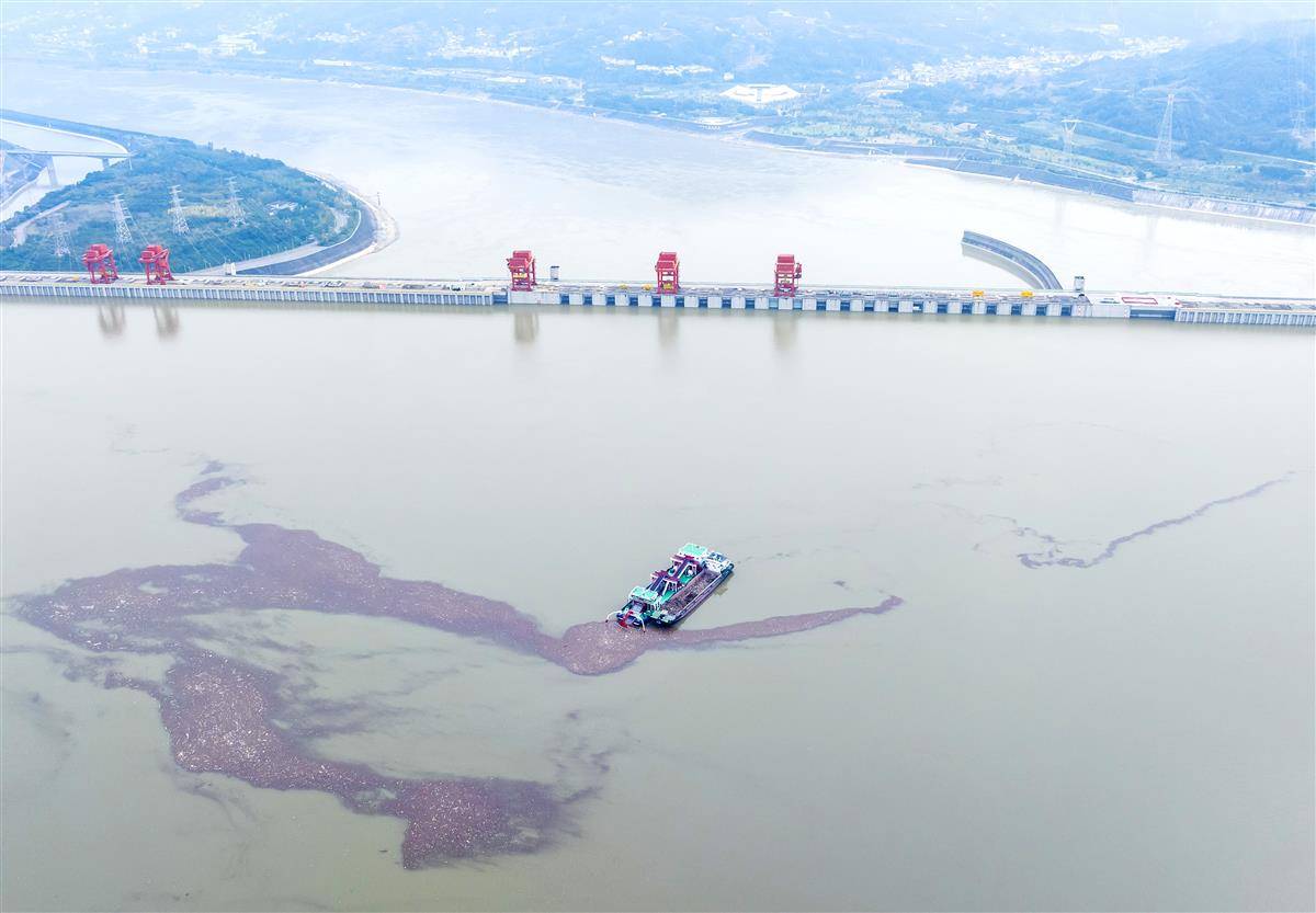 10月24日,清漂船舶在三峡大坝前清理蓄水后的江面漂浮物。