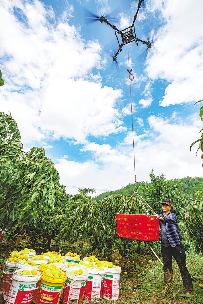 秭归县郭家坝镇西坡村,果农正操作无人机吊运锦绣黄桃。(湖北日报通讯员 彭强 摄)