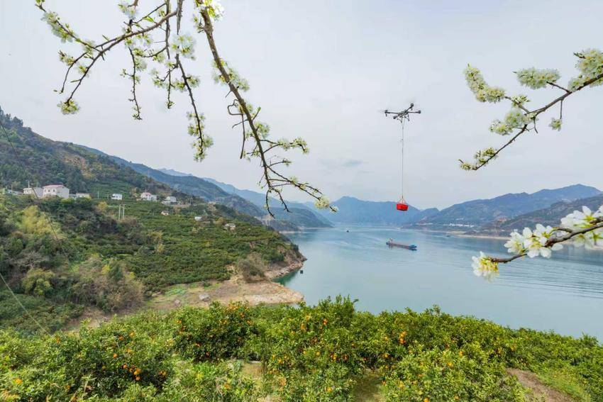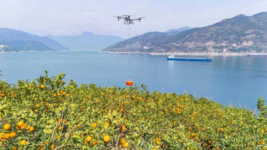 鄂西秭归县“四季有橙”。峡江两岸的果园,无人机将一筐筐脐橙吊运出山。