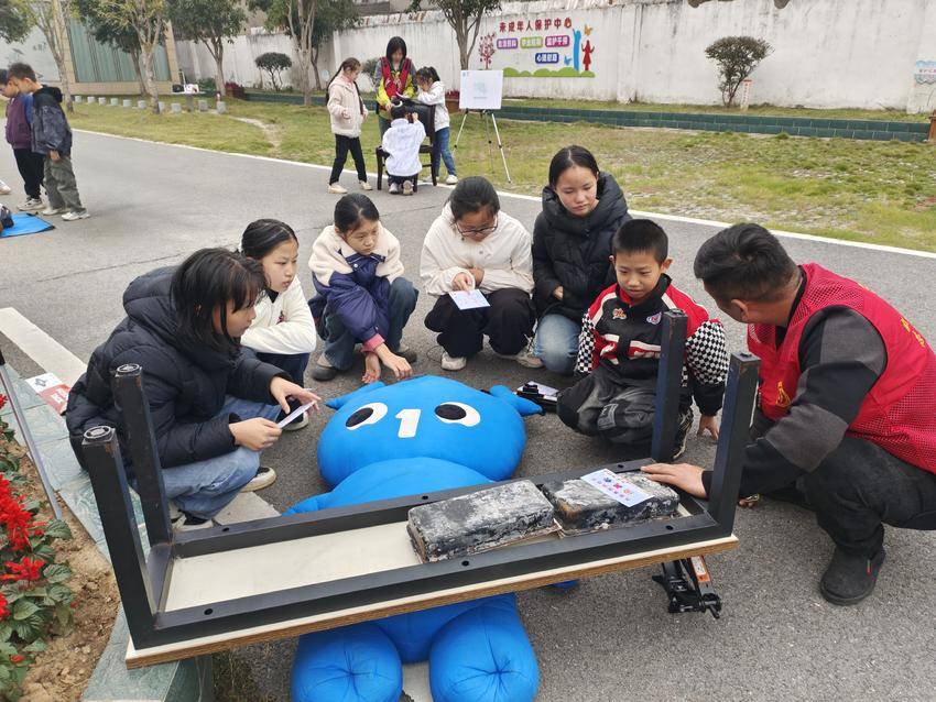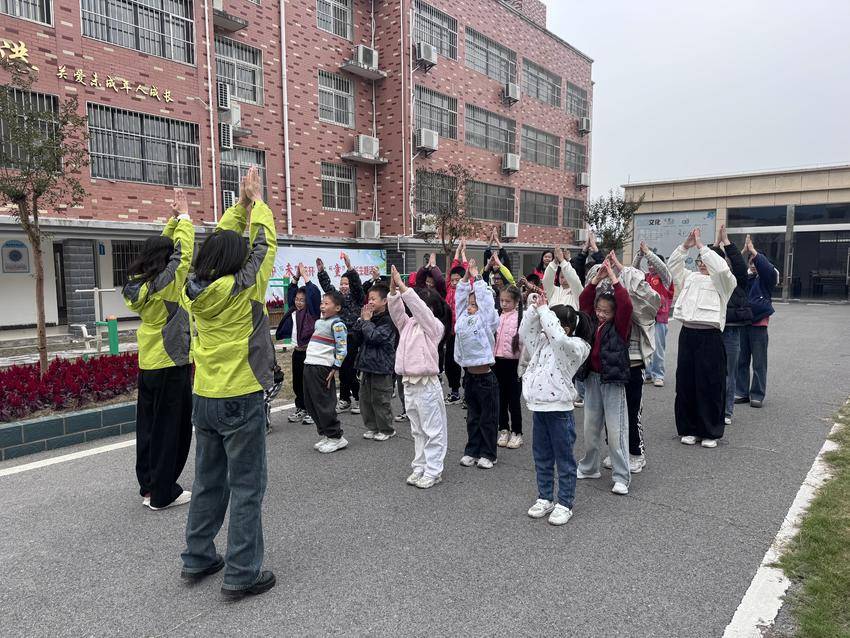 午饭过后,活动迎来了新的精彩环节。在志愿者的带领下,全体孩子一起学习了“防灾减灾操”。这套专门设计的动作不仅帮助孩子们活动身体、提振精神,更将防灾避险的知识融入其中,让他们在律动中加深了对应急避险要领的理解和记忆。