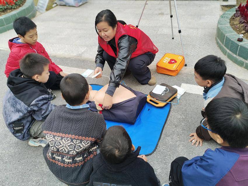 随着一声令下,活动进入了最受期待的核心实践环节——“自救互救技能大闯关”。孩子们被分为五个小组,轮流学习并挑战包括AED(自动体外除颤器)使用、千斤顶抬升、毛毯担架计时赛、绳结大比拼、腹部冲击法(海姆立克急救法)在内的五项关键急救技能。这种“在玩中学,在学中练”的沉浸式体验,极大地激发了孩子们的学习兴趣。他们认真聆听讲解,亲手操作实践,在志愿者的耐心指导下,一步步掌握了这些在危急时刻能保护自己、帮助他人的宝贵知识。