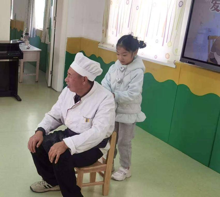 随后,孩子们将感恩之心化为实际行动。他们亲手为食堂的爷爷奶奶送上水果,用稚嫩的歌声表达感谢,还主动为爷爷奶奶捶背揉肩。“我给爷爷捶背,爷爷说可舒服了!”一名大班孩子高兴地分享道。简单的话语中洋溢着真挚的喜悦,温暖在师生与后勤人员之间自然流淌。