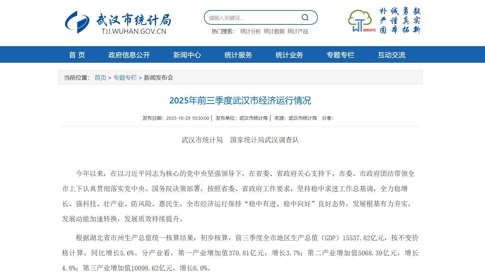10月29日,武汉市统计局、国家统计局武汉调查队公布今年前三季度武汉市经济运行情况。根据统一核算结果,前三季度,武汉市GD15537.82亿元,同比增长5.6%。以下为全文——