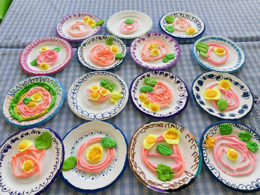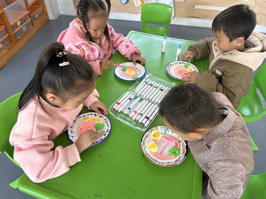 大班的孩子正在制作“长寿面”。他们细心地将黏土搓成长长细细的面条,配上绿色的“蔬菜”和黄色的“煎蛋”,一碗碗“色香味”俱全的长寿面,承载着孩子们希望长辈健康长寿、幸福长久的纯真愿望。