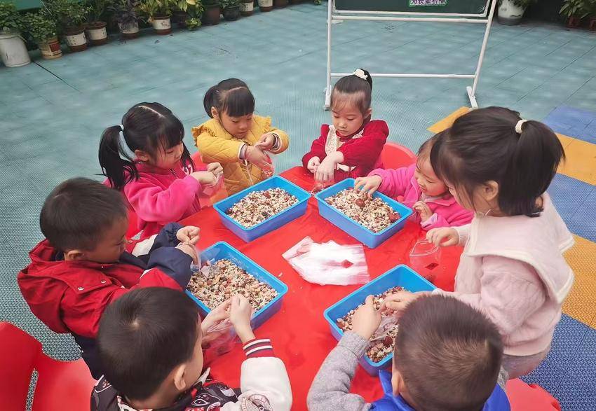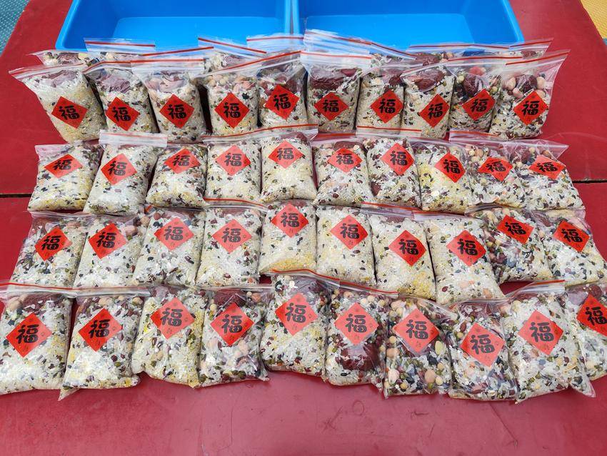 活动前,幼儿园老师细致讲解重阳节的起源及“吃百家米”的民俗寓意,引导孩子们领悟敬老的内涵。孩子们积极响应,从家中精心挑选米、红豆、花生、红枣等食材,带到活动现场。活动中,孩子们排着整齐的队伍,依次将食材倒入大盆中汇聚成满载爱意的“百家米”,凝聚着对长辈的美好祝福。社区工作人员与老师现场指导孩子们分装食材、张贴福字,让这份心意伴随孩子们送至家中长辈手中。