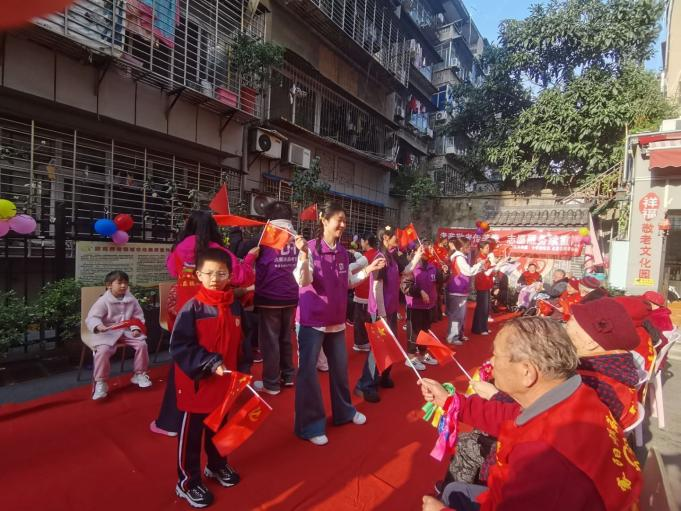 在互动环节击鼓传花游戏中,志愿者们与老人共同参与其中,鼓声阵阵,当红花传到手中时,志愿者和老人们积极主动表演节目,带来了歌曲《我的祖国》《唱支山歌给党听》等,将整场活动的气氛推到高潮。