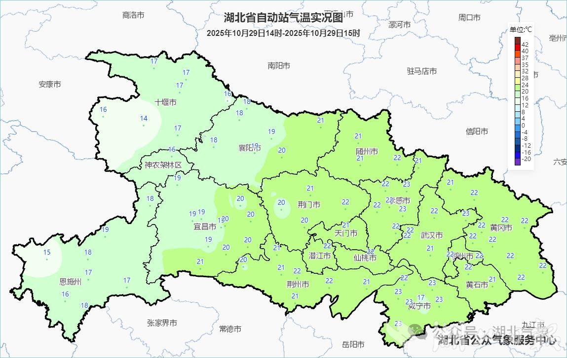 气象专家介绍,由于近期天气静稳,大气扩散条件一般。29 日省内多地遭遇局地浓雾,十堰、恩施、宜昌、随州、荆门、荆州的16个乡镇出现浓雾。白天全省自西向东逐渐涨云,十堰西部地区率先出现小雨,气温较28日明显下滑,西部多地降幅达3至5℃,保康降温幅度最高达6.4℃。下午15时监测显示,西部气温15至20℃,东部21至23℃,体感较前日偏凉。预计未来三天气温整体变幅不大,30日和31日最高气温普遍在20℃以上,11月1日恩施地区有所下滑。