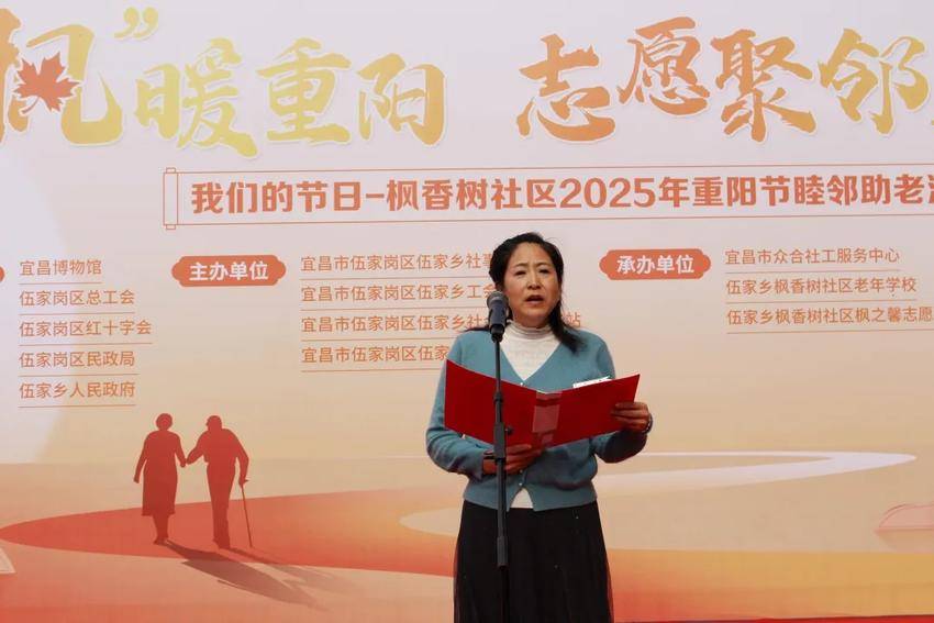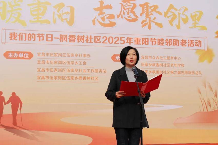 伍家乡人大副主席、工会主席张莉华发表讲话,强调伍家乡一直以来都高度重视养老服务工作,枫香树社区此次重阳节睦邻助老活动是一次非常有意义的尝试,为全乡的养老服务工作起到了很好的示范作用,也希望通过这样的活动,能够带动更多的人关注老年人的生活,为社区养老工作添砖加瓦。