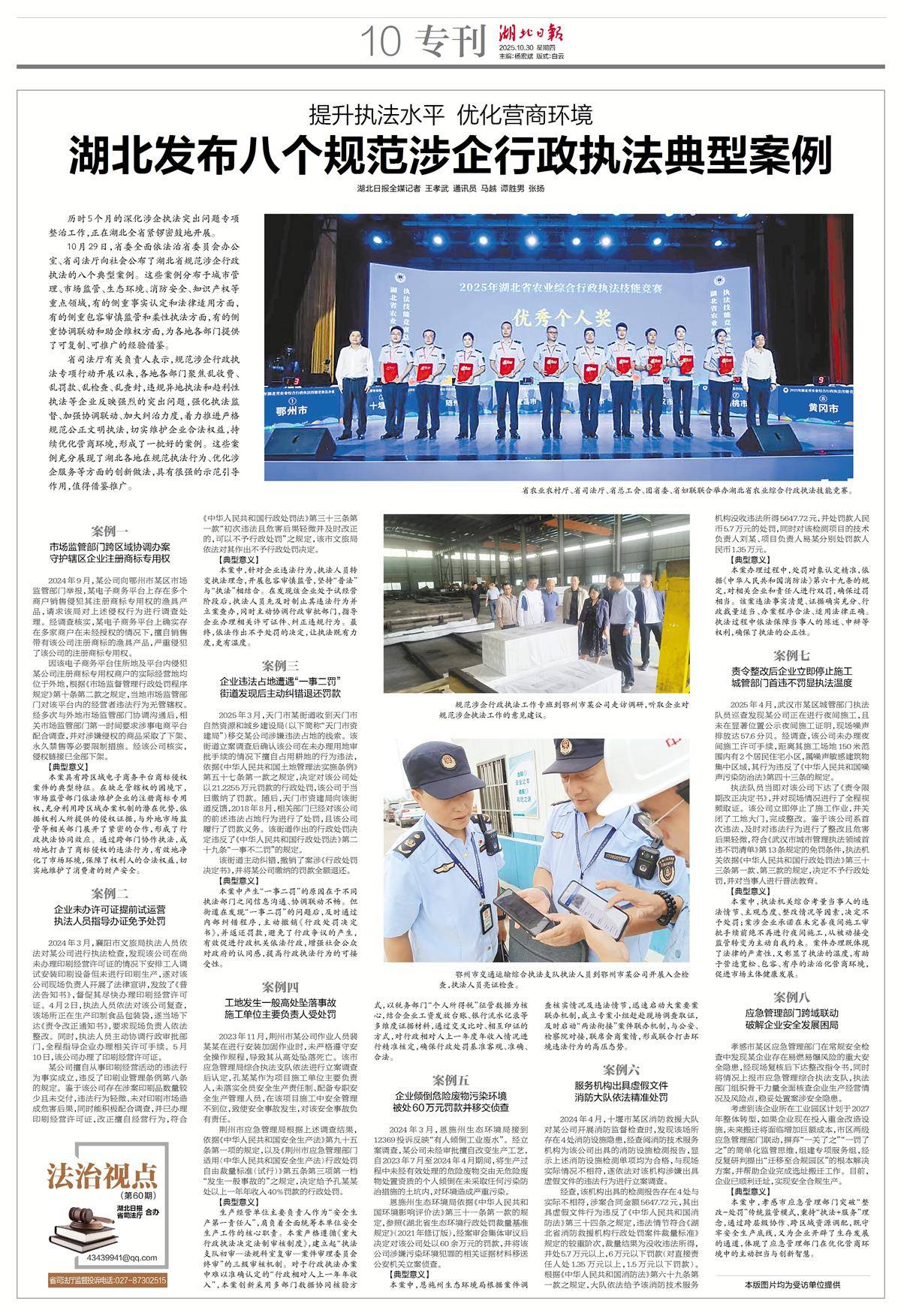 10月29日,省委全面依法治省委员会办公室、省司法厅向社会公布了湖北省规范涉企行政执法的八个典型案例。这些案例分布于城市管理、市场监管、生态环境、消防安全、知识产权等重点领域,有的侧重事实认定和法律适用方面,有的侧重包容审慎监管和柔性执法方面,有的侧重协调联动和助企维权方面,为各地各部门提供了可复制、可推广的经验借鉴。