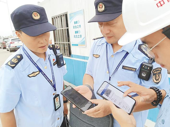 鄂州市交通运输综合执法支队执法人员到鄂州市某公司开展入企检查,执法人员亮证检查。
