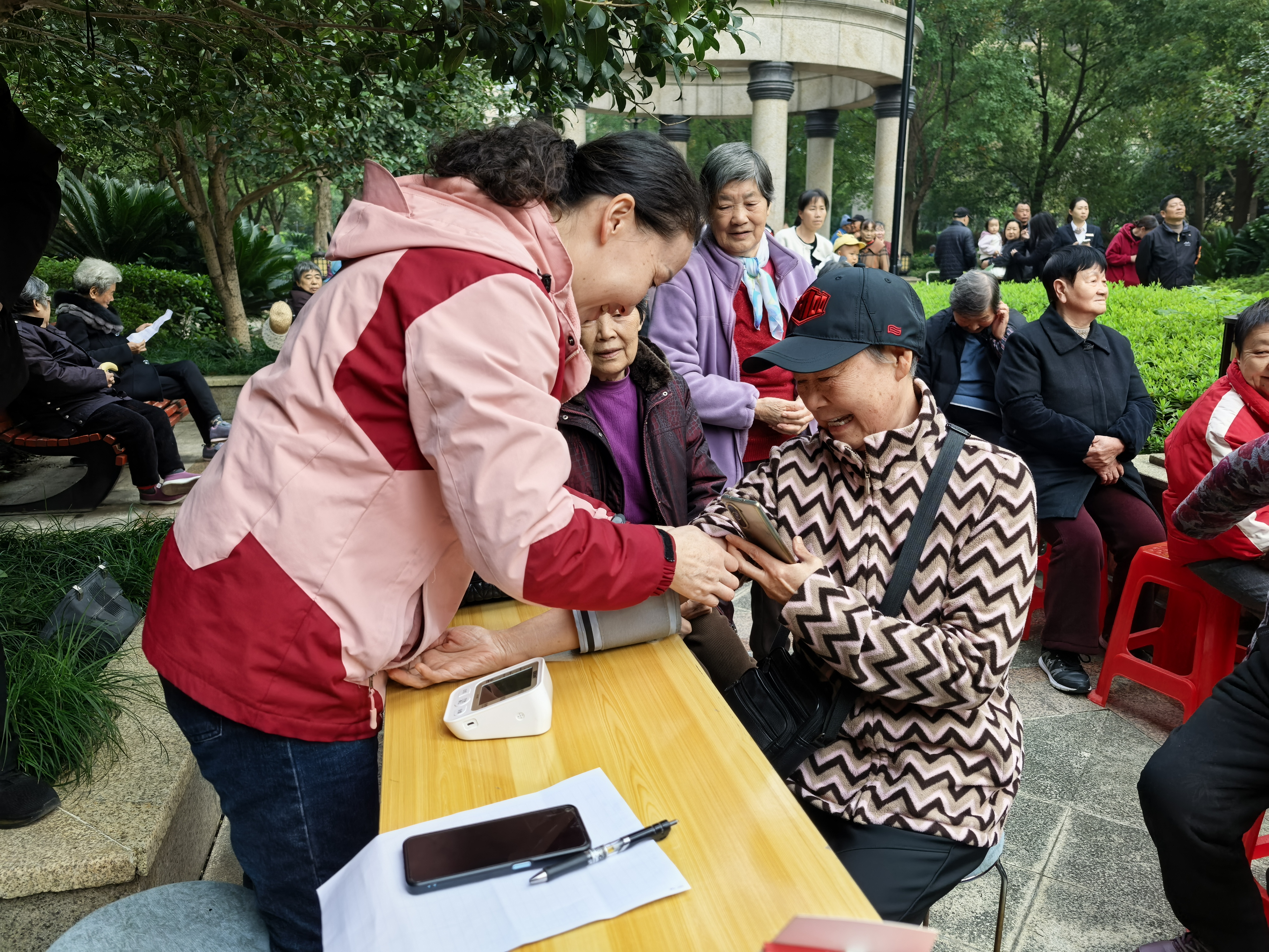 活动现场氛围温馨,内容丰富多彩。老年文艺团队带来了歌舞、戏曲等精彩表演。趣味套圈游戏区域欢声笑语不断,实用的小奖品更添活动乐趣。健康驿站为长者提供免费血压测量服务,并耐心解答日常健康疑问。茶话会区域准备了水果、茶点,志愿者与长者们围坐一堂,共话家常温暖。