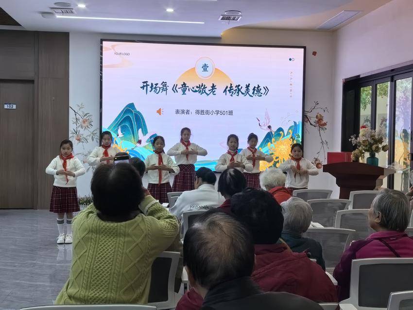 活动现场,得胜街小学 501 班的同学们带来开场舞《童心敬老 传承美德》。舞台上,孩子们身着整洁的校服,系着鲜艳的红领巾,用整齐划一的动作、充满朝气的姿态,传递着对老人的敬爱与对中华传统美德的传承。除了舞蹈表演,同学们在现场还用树叶制作祝福贺卡,小小的礼物承载着浓浓的敬老情。